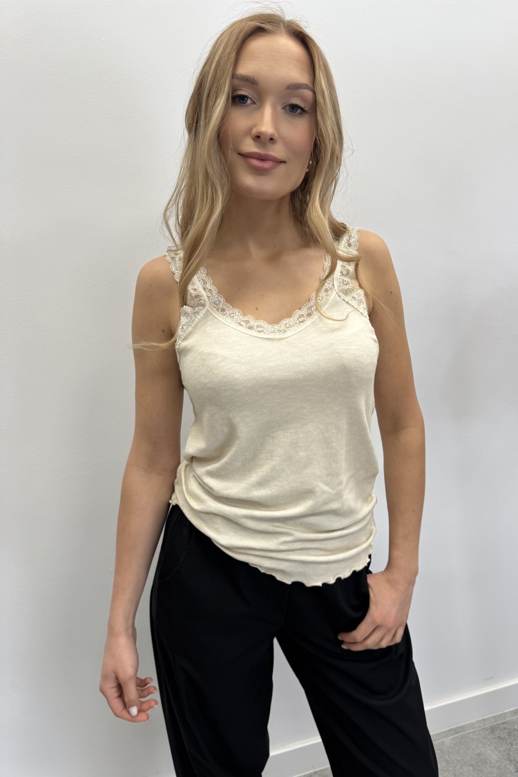 Subtelne, koronkowe ramiączka dodają mu lekkości i romantycznego charakteru, sprawiając, że top prezentuje się wyjątkowo efektownie zarówno solo, jak i pod marynarką czy kardiganem.